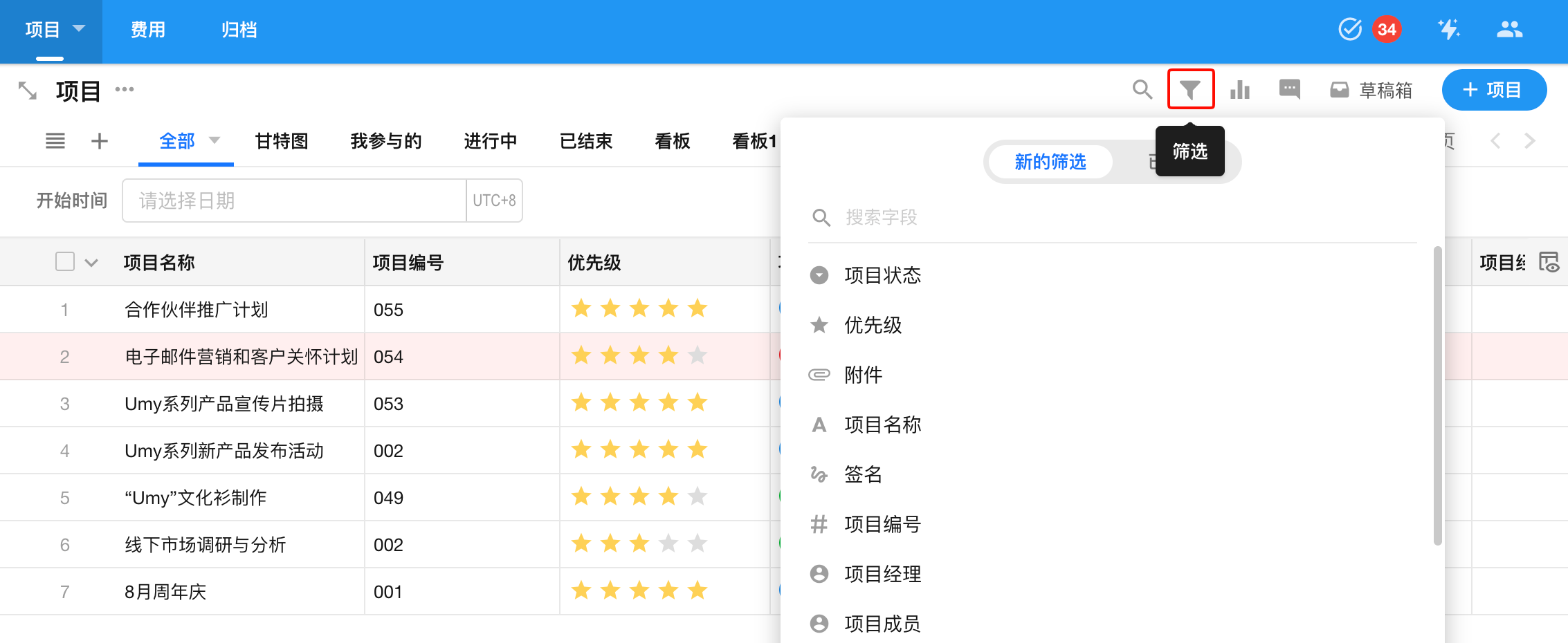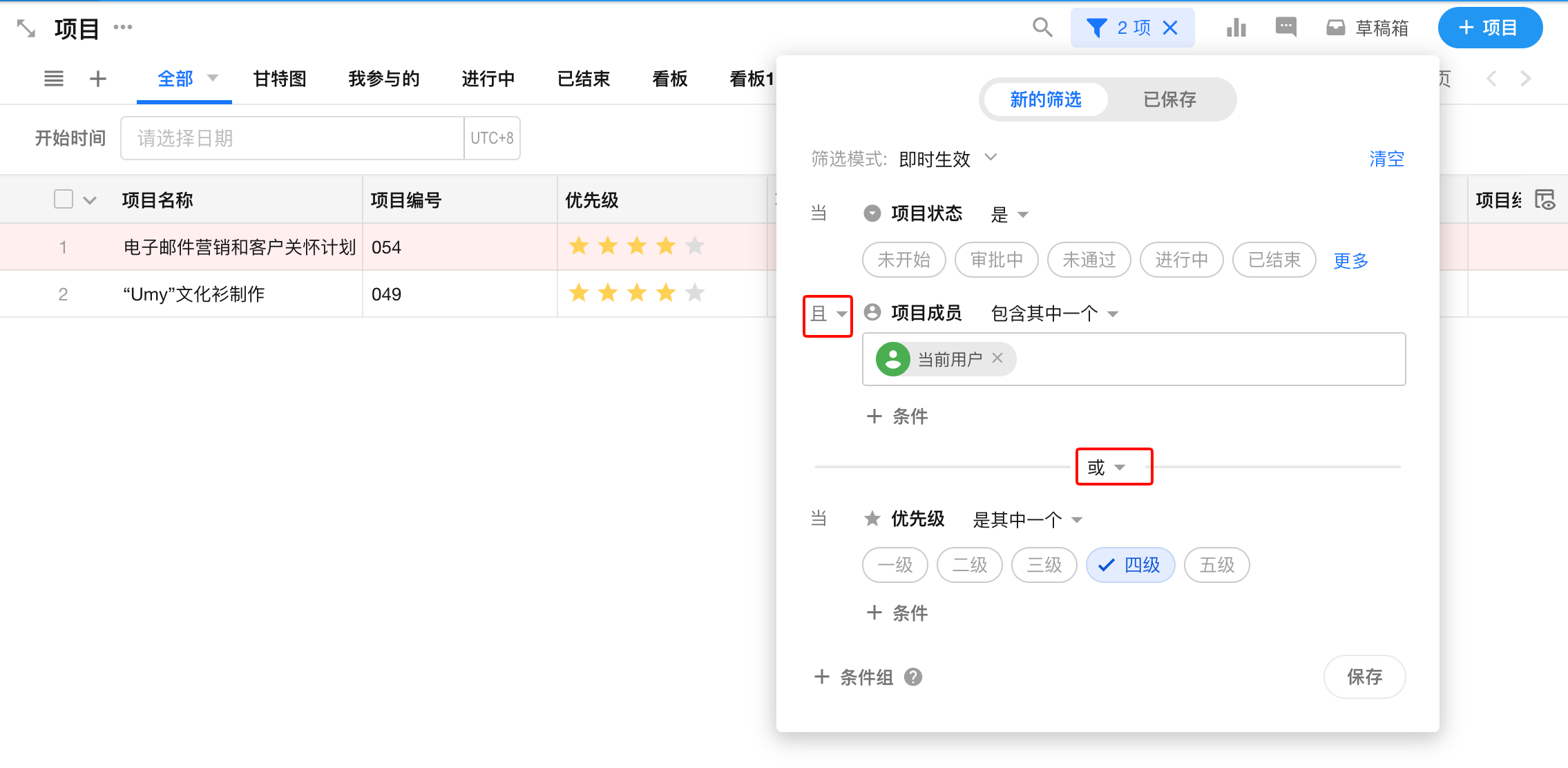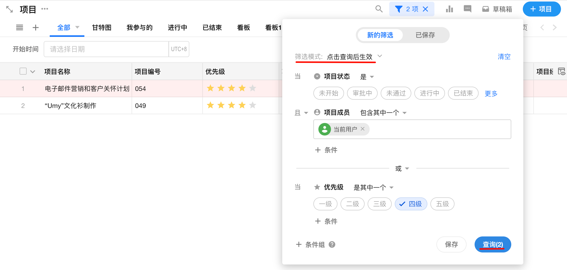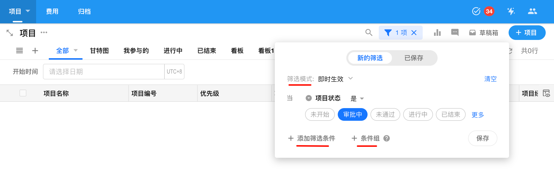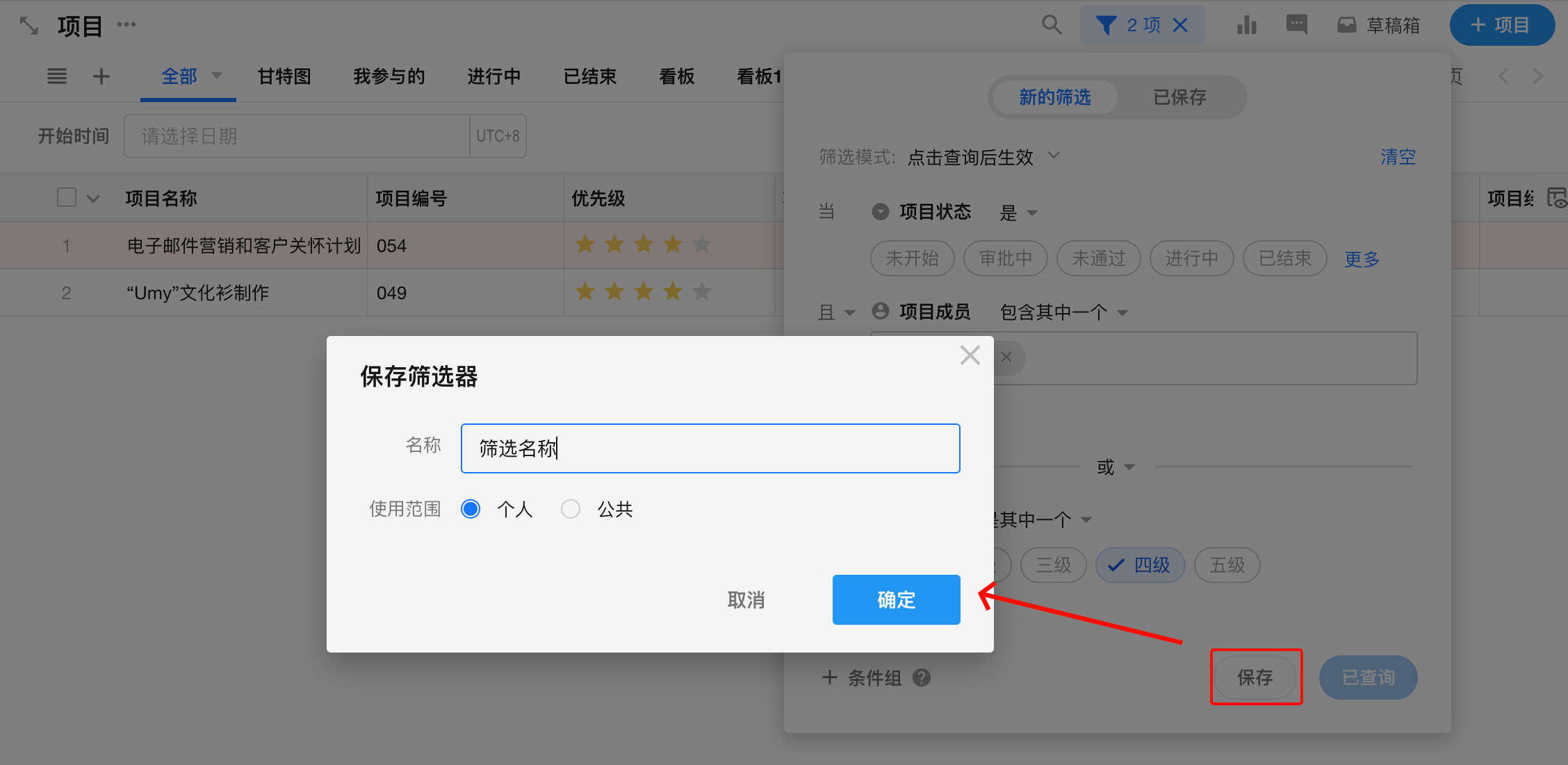 每个人都可以自定义筛选条件,并支持保存为筛选器,方便下次直接使用。