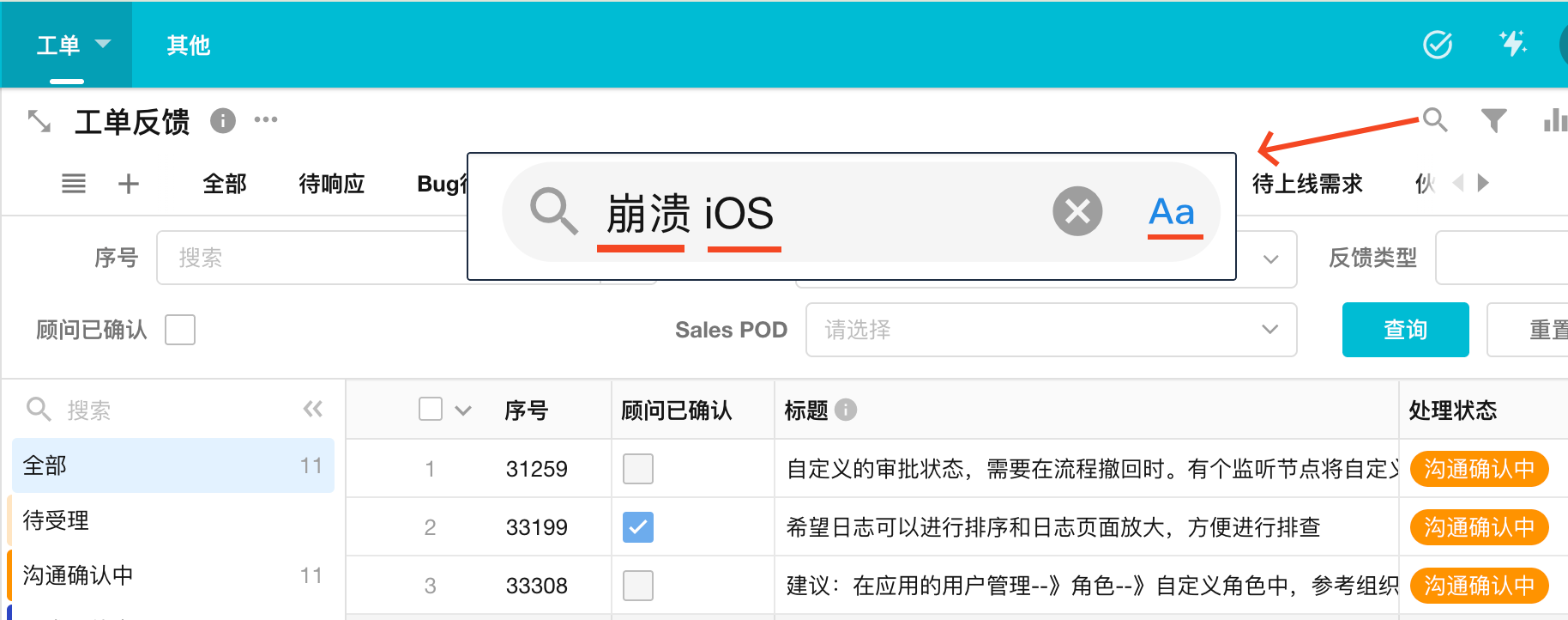 示例:在工单表中,记不清准确的标题和描述,只记得是iOS APP崩溃的问题,可输入关键词输入: