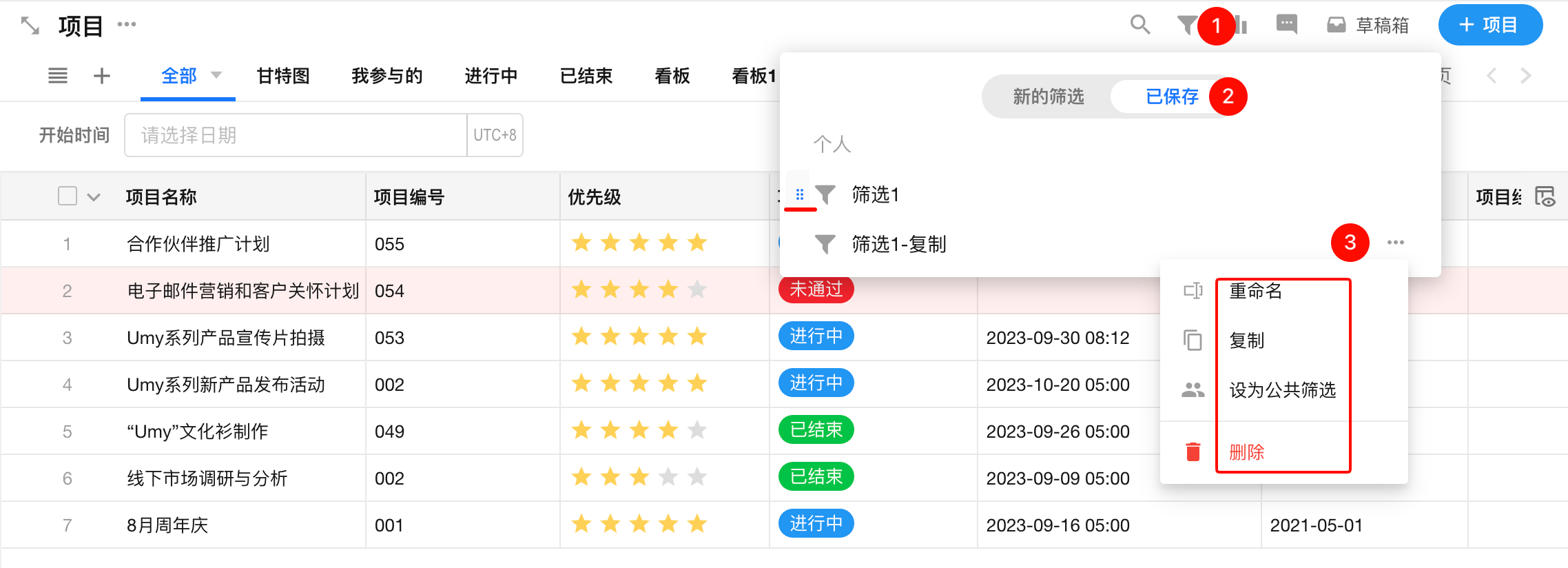 已保存的筛选器,可以进校删除、重命名、修改、复制、排序等操作。