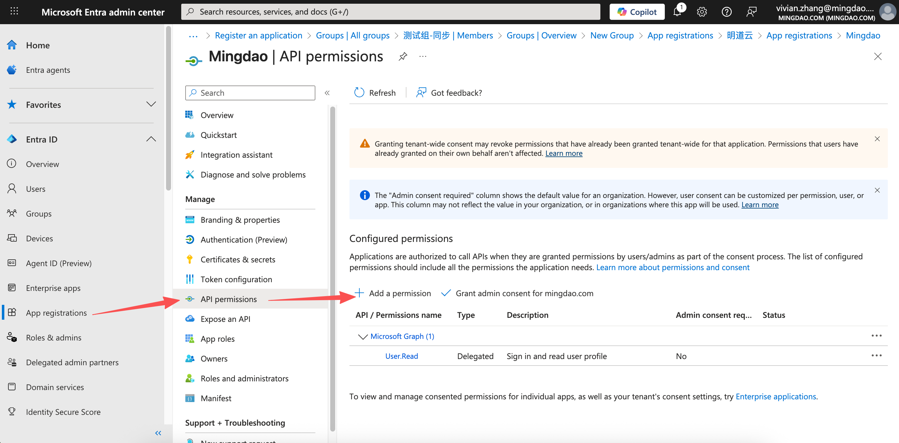 在 Entra 后台打开应用点击 API 权限菜单,点击创建权限按钮。