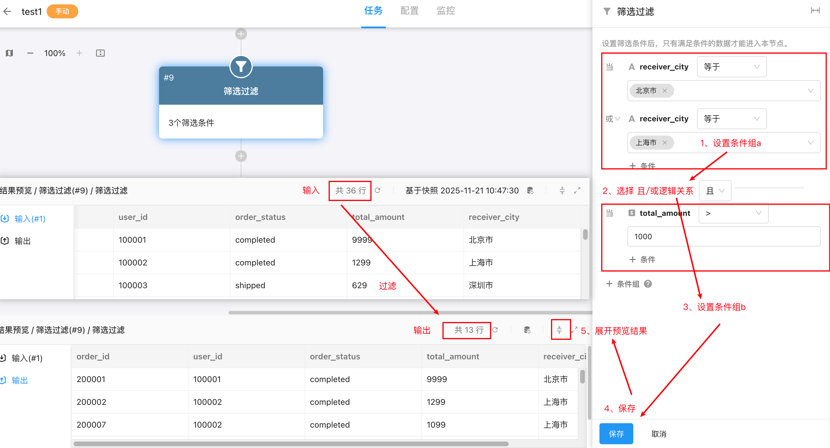 “筛选过滤”节点用于对输入数据进行条件过滤。用户可通过单个筛选条件或条件组,仅将满足规则的数据传递到下游节点。
