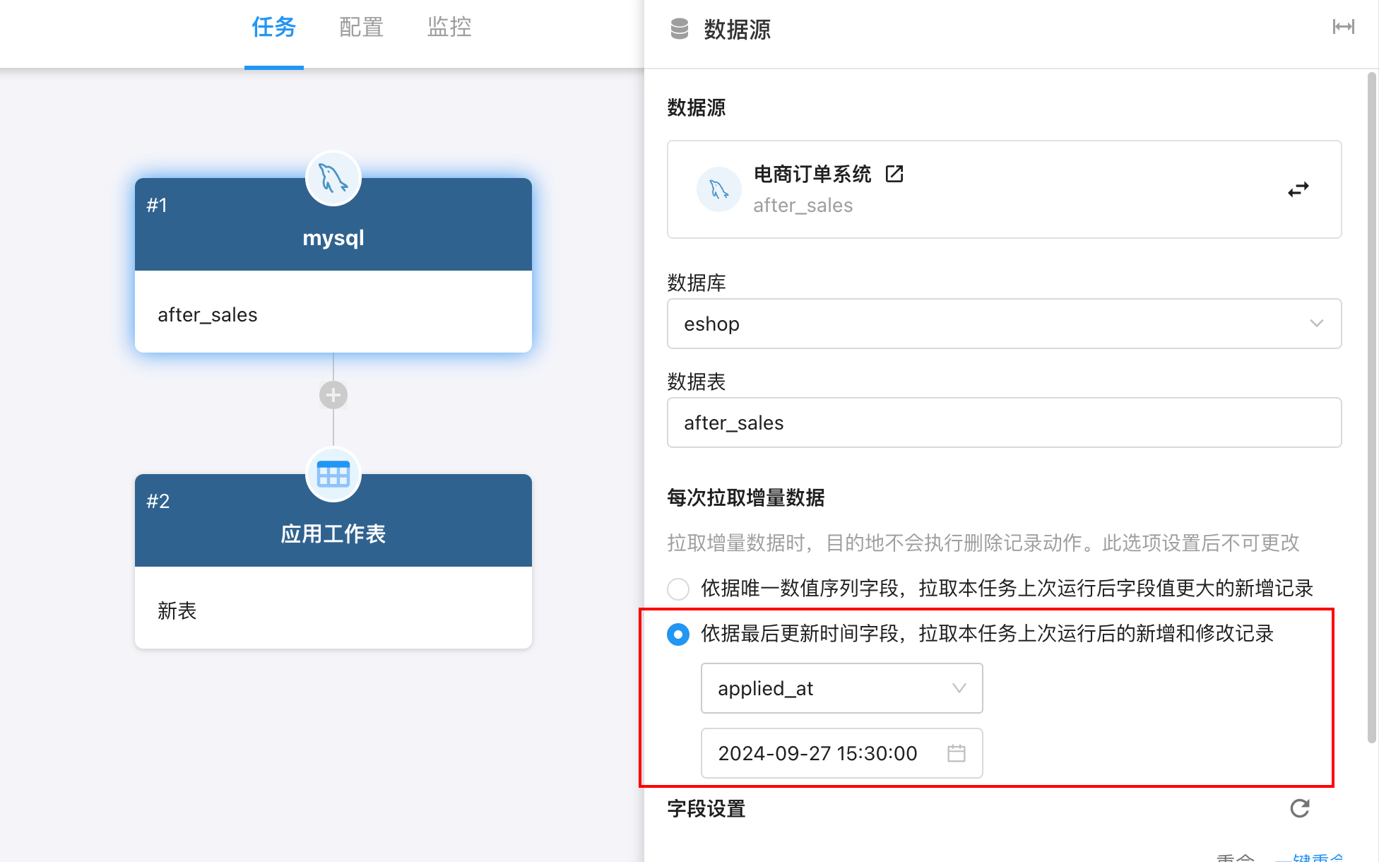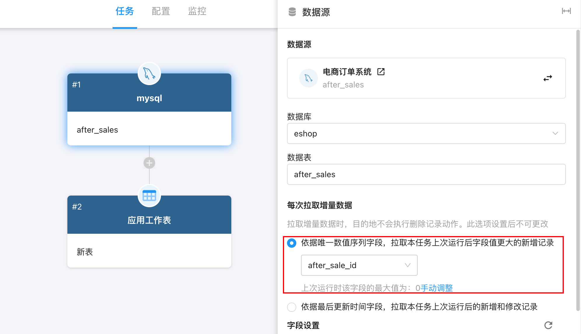 系统会使用用户选择的“唯一数值序列字段”(通常是自增 ID,如:after_sale_id),判断哪些记录属于“上次运行之后新增的数据”。