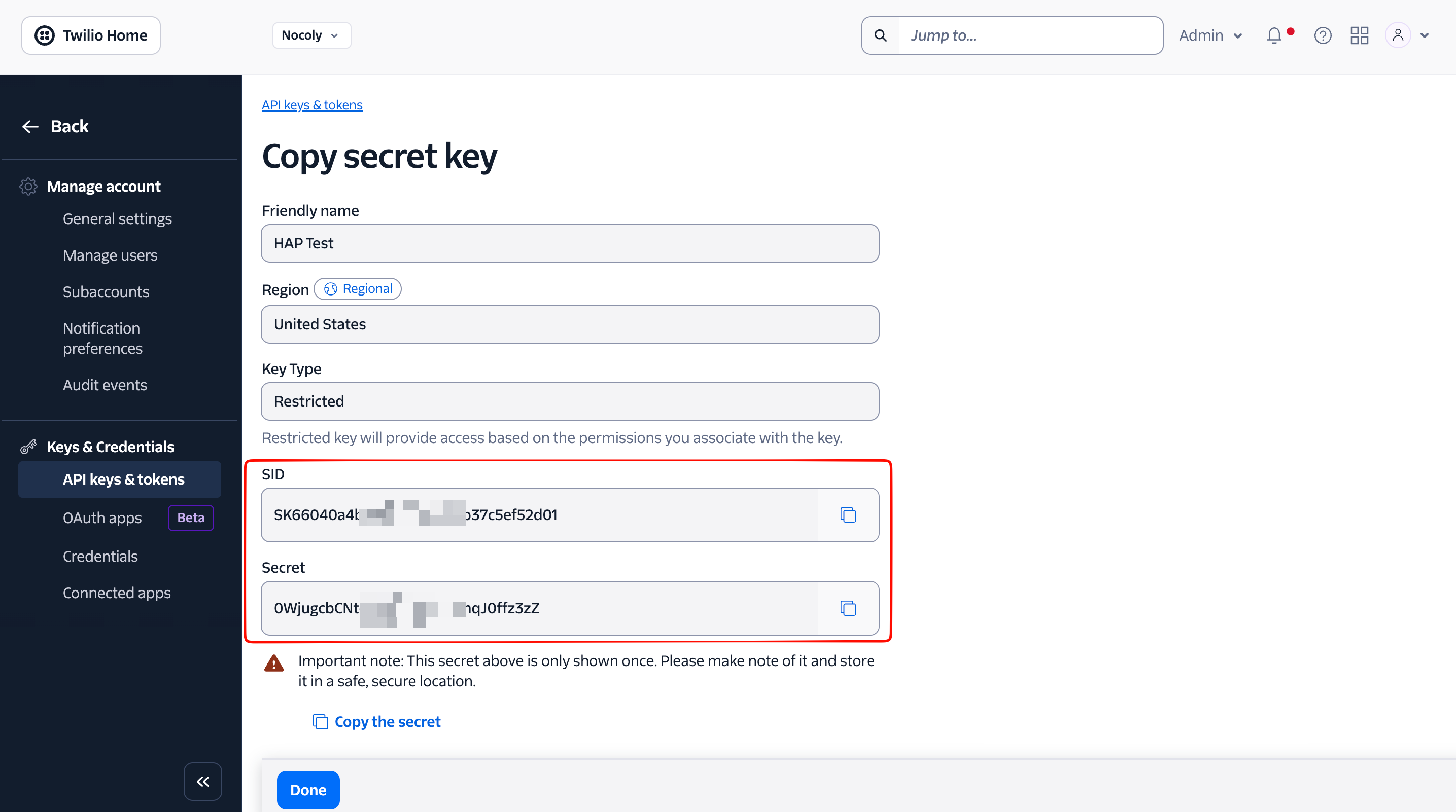 • 确认填入 HAP 平台的 Messaging Service SIDAPI Key/Secret 准确无误(无多余空格)。